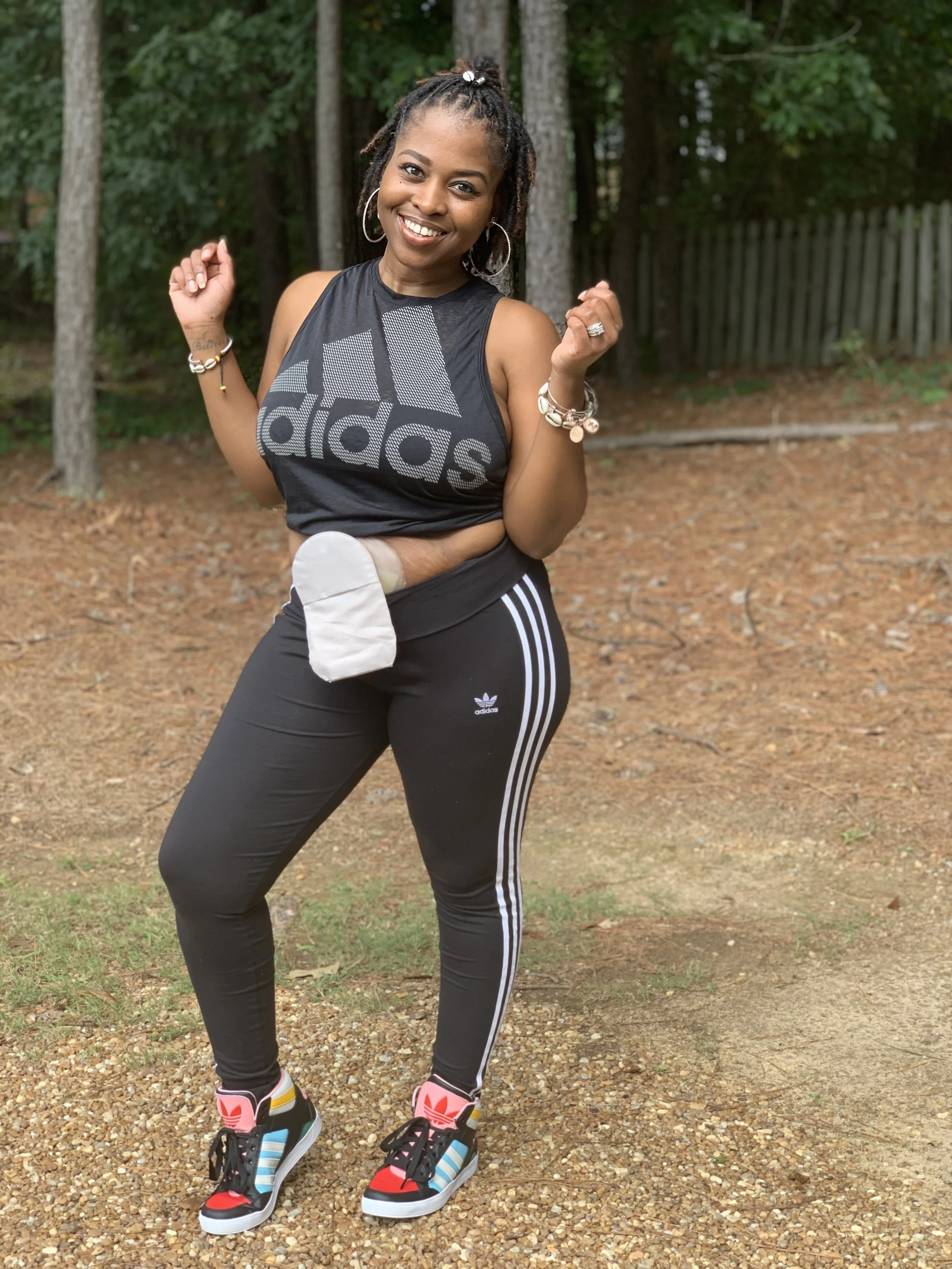 Kimberly M. Hooks in 2020, confidently showing her ostomy bag after surgery for ulcerative colitis.